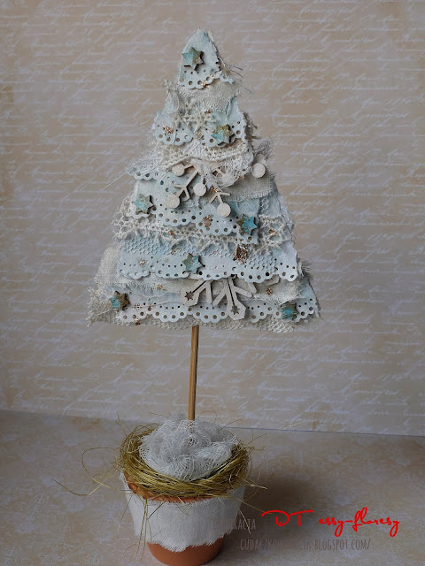 Do przygotowania tej choinki użyłam 2 papierowych trójkątów, które ozdobiłam kawałkami papieru, koronki i materiału pozostałego po innych projektach. Dodałam Essowych tekturek, odrobiny gesso, perłowej mgiełki i złotego brokatowego Splash'a. Oba trójkąty udekorowałam w identyczny sposób, skleiłam je umieszczając pomiędzy niewielki patyczek. Gotową choinkę zamontowałam w doniczce. Zapraszam do obejrzenia zdjęć :)
